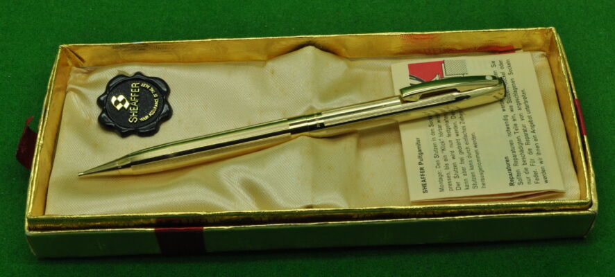 English Sheaffer Imperial Touchdown Pencil in Gold fill, Parallel line Pattern. In Absolute MINT Unused condition in original Gift Box.