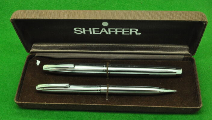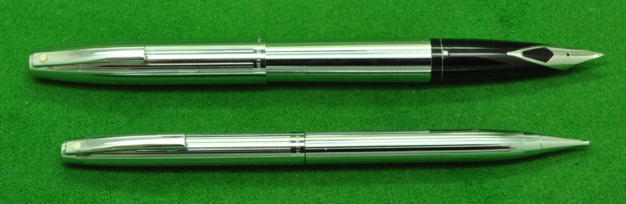 Sheaffer Triumph Imperial SET in Chrome with Line Pattern. Fountain Pen and Pencil. Both In Mint Condition. Fountain Pen, Cartridge fill, fitted with the original medium tipped nib