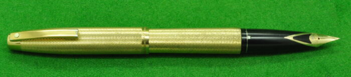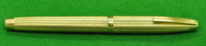 Sheaffer Imperial in Fine Barley Pattern Gold fill. In Perfect Near Mint condition but with small indentation to cap top. Fitted with the original 14kt gold medium tipped nib. Cartridge fill but complete with converter