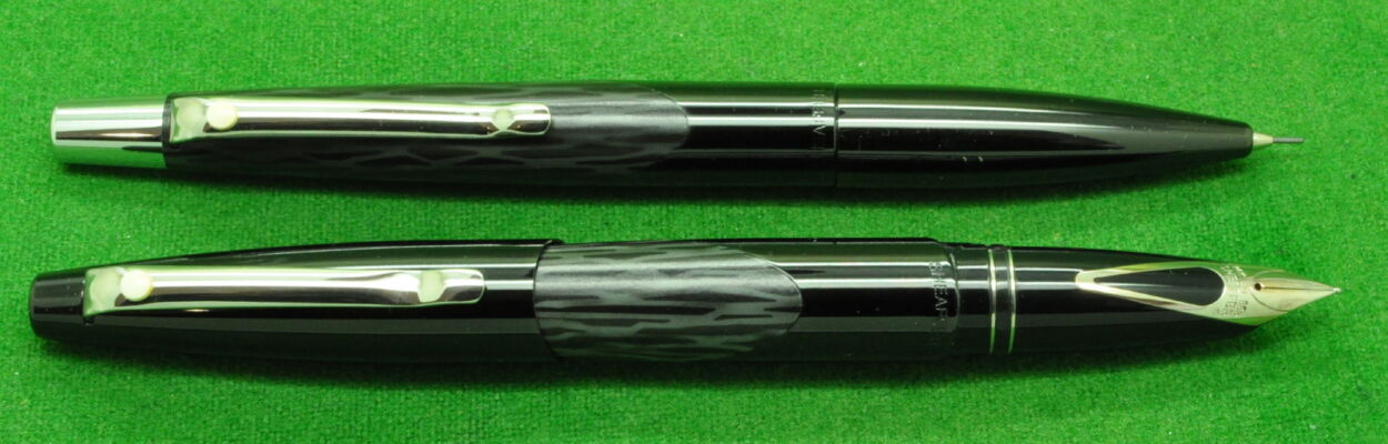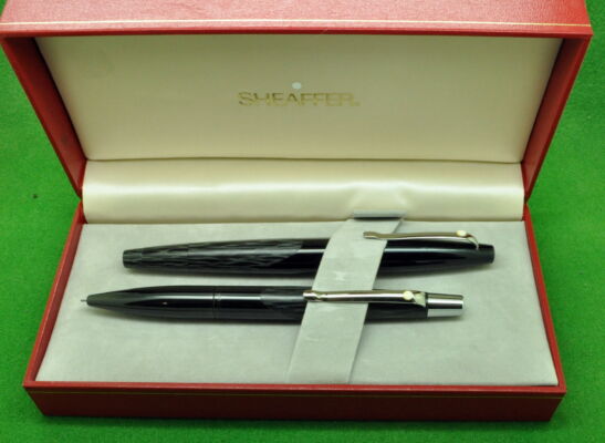Sheaffer Intrigue 614 SET in Gloss Black with Stenciled matt black pattern. Fountain Pen and Ballpoint. Both in absolute MINT Unused Condition in Sheaffer box but not original Box. Fountain Pen fitted with the original 14kt white gold fine tipped nib.