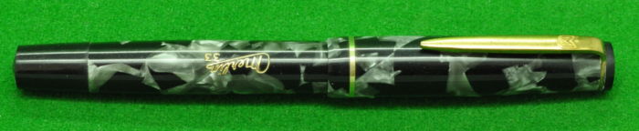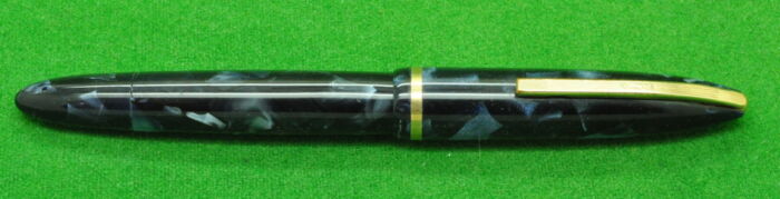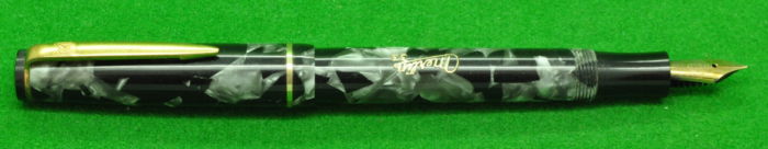 Merlin in Pearl and Black Marble with gold fill trim. In MINT Condition. Button fill. Fitted with the original 14kt gold medium tipped, semi flex nib.
