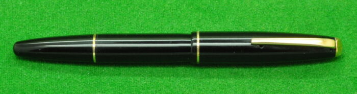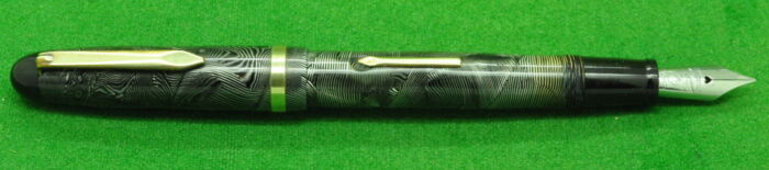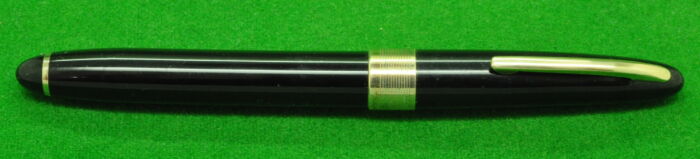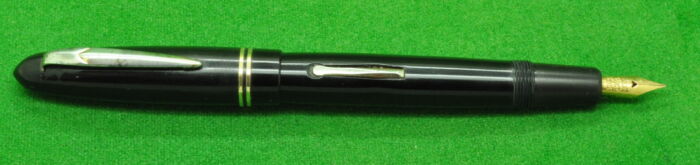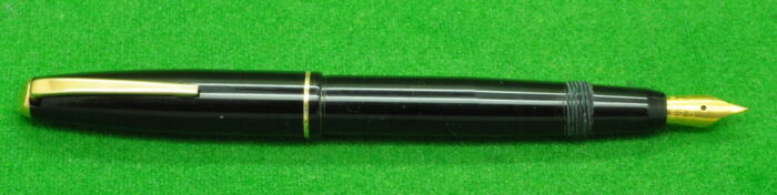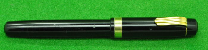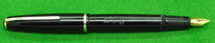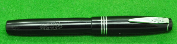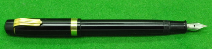 Excelsio 625 in Black Hard Rubber with gold filled trim. In Perfect Condition but with some plate loss to clip. Lever fill. Fitted with th original 18kt gold full flex medium tipped nib giving a wonderful writing style.