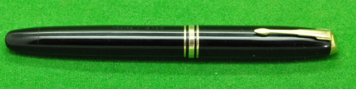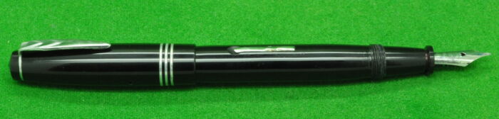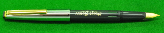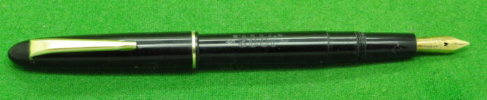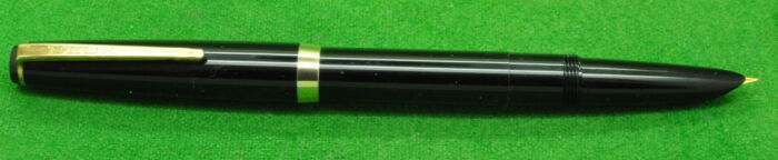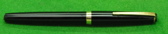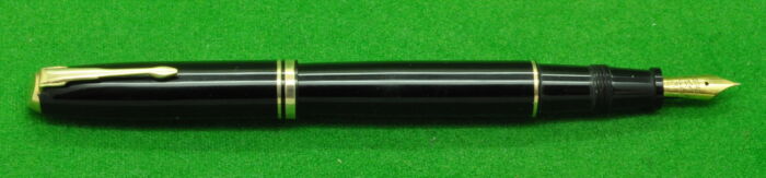 Plexor in Black with Gold filled trim. In Mint condition. Made Under Licence from Parker. Interesting Pen. Button Fill. Fitted with the original semi flex medium tipped nib.