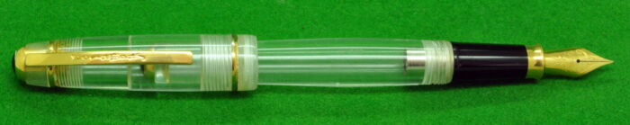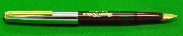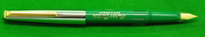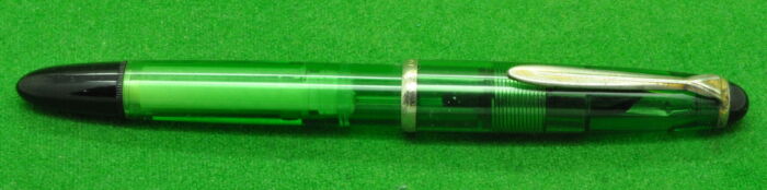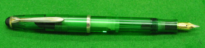 Geha ERO Demonstrator in Transparent Green. In Perfect condition but with some plate loss to cap lip. Piston Fill. Fitted with the original, semi flex , smooth medium tipped nib.