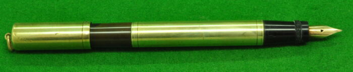 Early “The King” Safety Pen by The Milan Based Company SAFIS with 18kt gold fill overlay. In Good condition. Fitted with the original 14kt full flex fine tipped Nib giving a wonderful writing style.