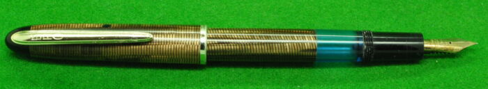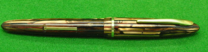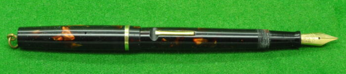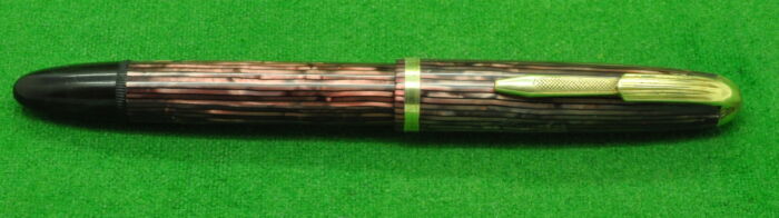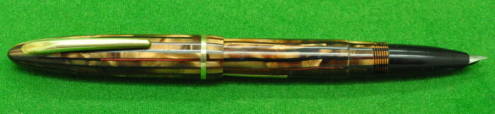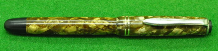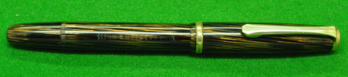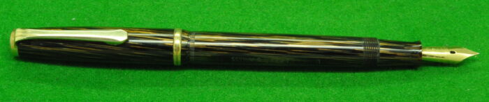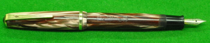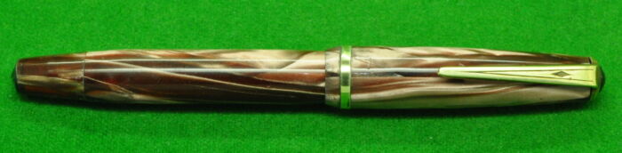 Beautiful Union Fairline Airless in Striated Pearl Brown Marble with gold filled trim. In Nr MINT Condition. Piston Fill. Fitted with the original 14kt gold semi flex medium tipped nib.