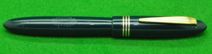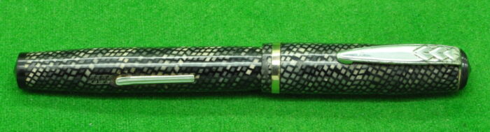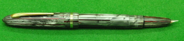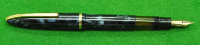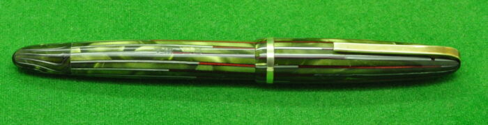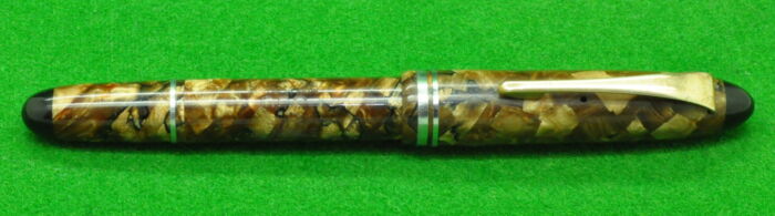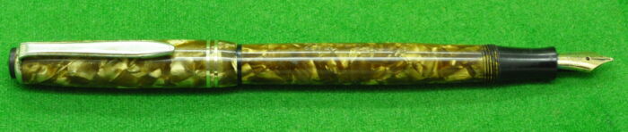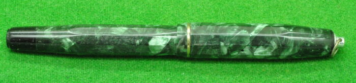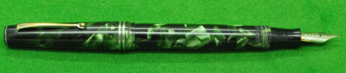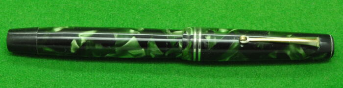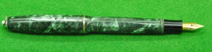 RARE Large Victoria in Pearl Green Marble with Nickel Silver trim. In Perfect Near Mint Condition. Button Fill. Fitted with the original Wartime Steel , Semi Flex Medium tipped nib. Chunky Large pen measuring 143 mm long capped