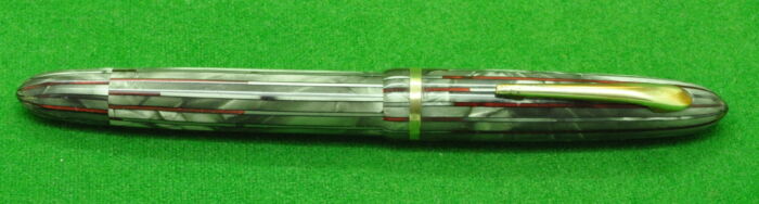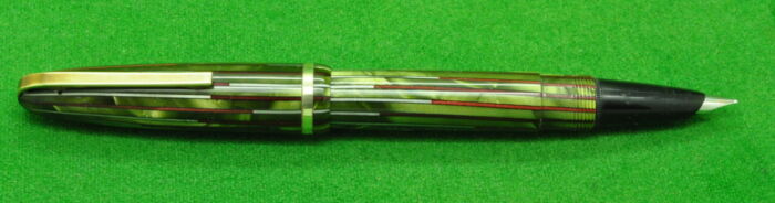 Re-Ma Fountain pen in a wonderful Scarlet & Silver Pinstriped Pearl Green with gold filled trim. In Mint condition. Button Fill. Fitted with the original medium tipped nib.