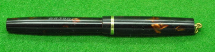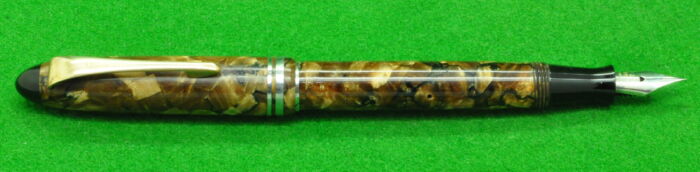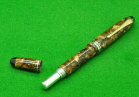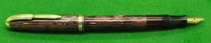 Re-Ma Fountain pen in a wonderful Scarlet Pinstriped Pearl Brown with gold filled trim. In Mint condition. Lever Fill. Fitted with the original medium tipped nib.
