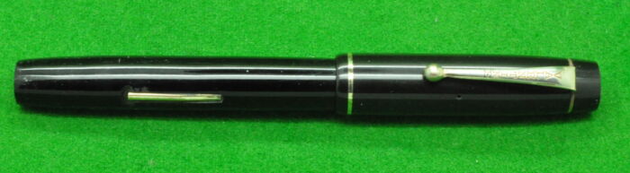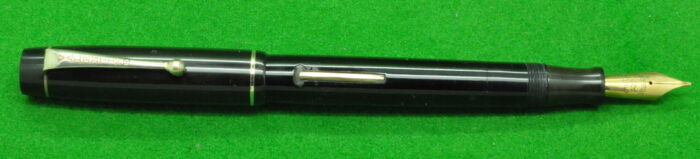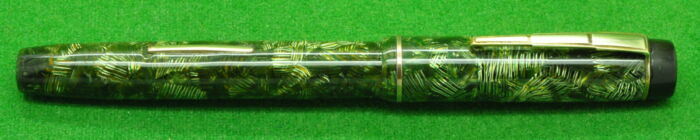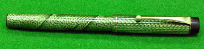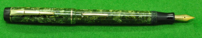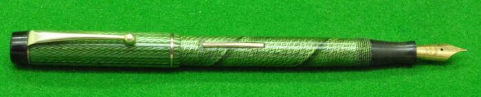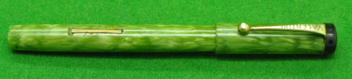 Scarce Valentine 50 In Jade Green with Gold filled trim. In Near Mint Condition but with shortened cap. Lever fill. Fitted with the original full flex, wet noodle 14kt gold fine  tipped nib giving a wonderful writing style