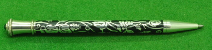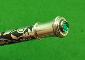 Beautiful Solid Silver filigree ballpoint with Dark Green Laquer and Green Finial Stone. Unknown maker. In MINT Unused condition. Takes Standard Parker Refills. Full Size High Quality Pen measuring 132 mm long.