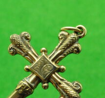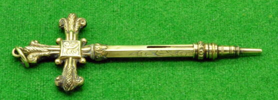 Beautiful 9kt gold pencil made in shape of an ornate cross with Hand engraved decoration. Most likely made by Mordan but no markings. In Perfect Condition. Measures 58 mm closed and 73 mm when fully extended. Highly Collectable.