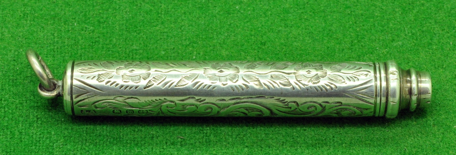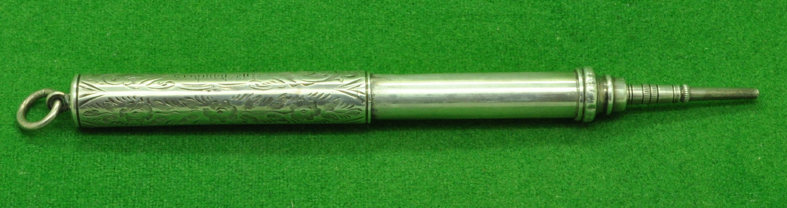 Large Telescopic and twist action Victorian Solid Silver Pencil with Beautiful Hand engraved Decoration. Unusual Combination of Telescopic action to extend then twist to expell the Nozzle. In Perfect Condition. Fully hallmarked and dated 1986. Makers Initial J.A. Works Perfectly. Measures 73 mm long closed and 140 mm long fully extended. . Takes 1.5 mm lead available here