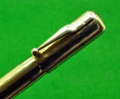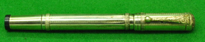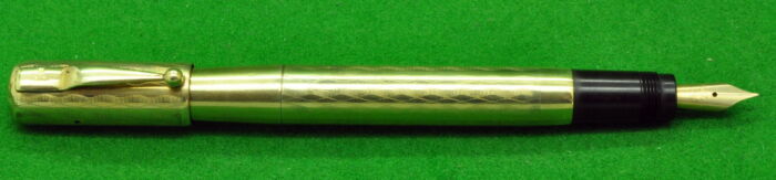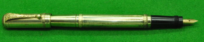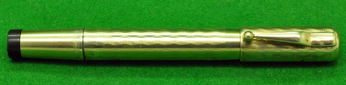 Italian Safety Pen in 18kt gold fill, wave pattern. Marked “Sperial Super 18KR”In Perfect Condition but with some small areas of brassing.. Fitted with the original 14kt gold full flex fine tipped nib . Measures 122 mm long capped. All new Seals fitted – works perfectly and does not leak