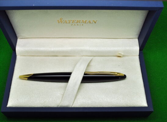 Waterman Carene Ballpoint In Black Laque with gold filled trim. IN Mint Unused condition in original box.
