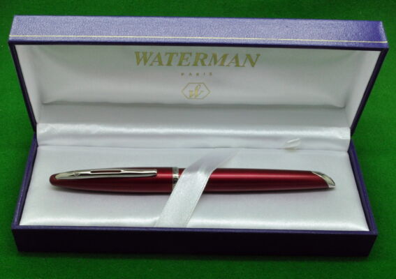 Waterman Carene in Satin Red with Chrome Trim. In Mint condition in original box. Fitted with the original 18kt gold medium tipped nib