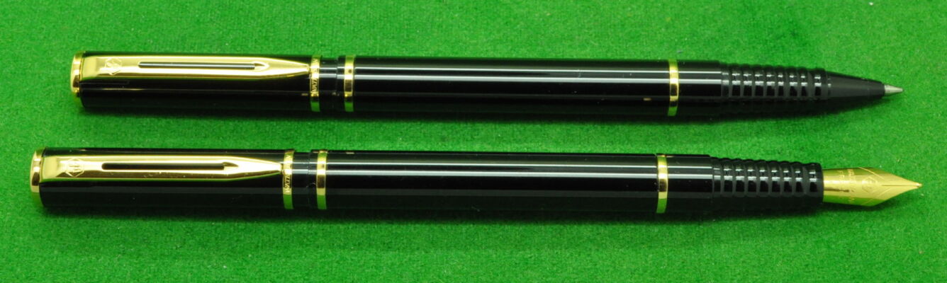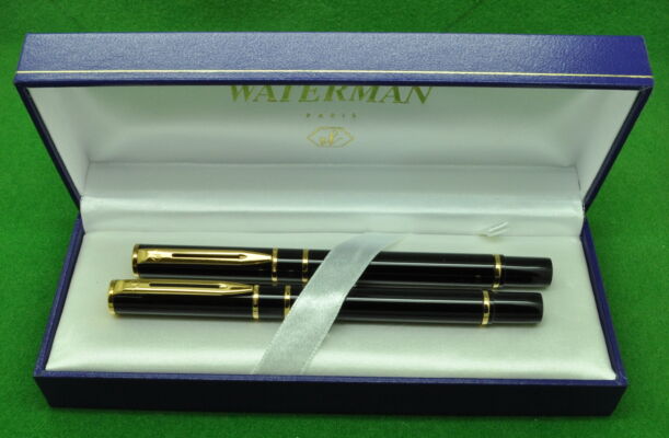 Waterman Laureat Set in Black Laque with gold filled trim. Fountain Pen and Rollerball. Both MINT Unused in Original Box. Fountain Pen, complete with converter, fitted with the original medium tipped nib.