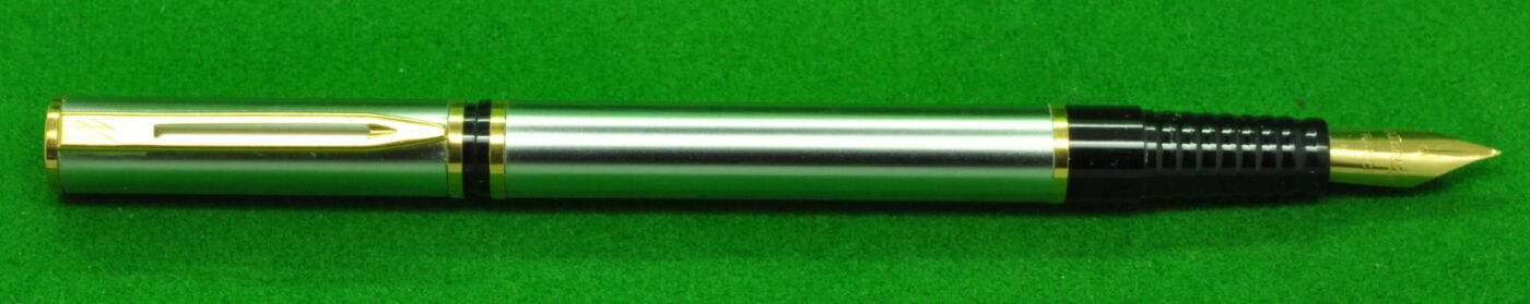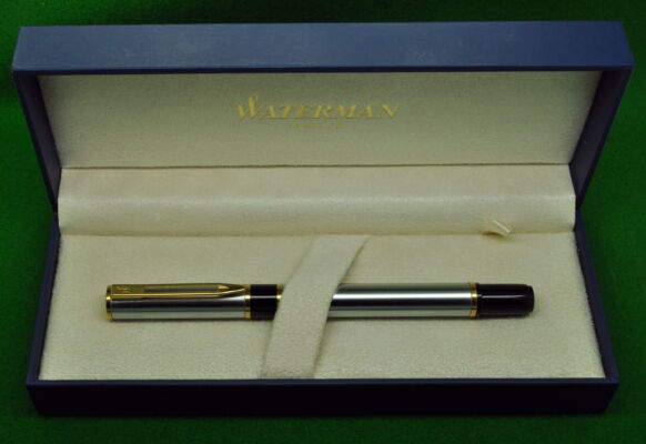 Early Waterman Laureat Fountain Pen in Stainless with gold filled trim. MINT Unused in Original Box. Complete with converter, fitted with the original medium tipped nib.