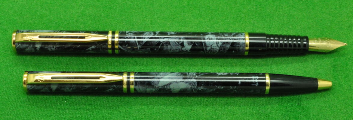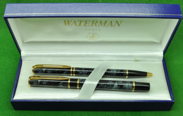 Waterman Laureat SET in Scarce Grey Mosaic finish with gold filled trim. Fountain Pen and Ballpoint. Both In Absolute Mint Unused Condition in original Box. Fountain Pen Fitted with the original medium tipped nib.