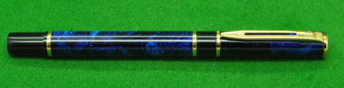 Waterman Laureat Fountain Pen in Blue Marble with gold filled trim. In Mint Condition. Fitted with the original medium tipped nib.