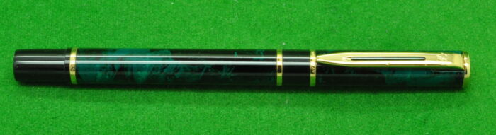 Waterman Laureat Fountain Pen in Green Marble with gold filled trim. In Mint Condition. Fitted with the original medium tipped nib.