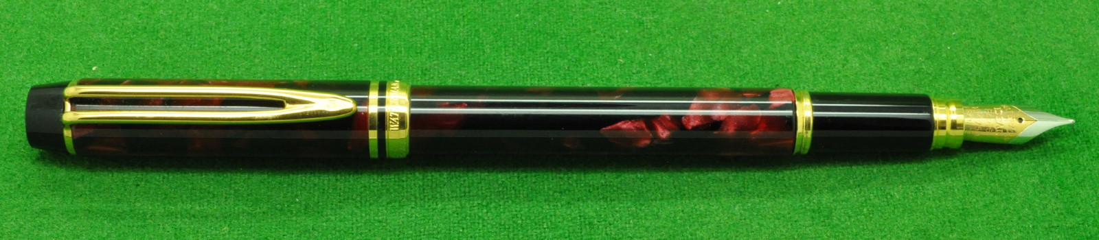 Waterman Le Man 200 In Black & Burgundy Marble with gold filled trim. In Absolute MINT Unused condition in original Box. Fitted with the original Twin Tone, 18kt Gold, semi flex medium tipped Nib.