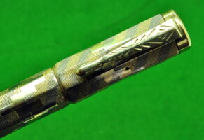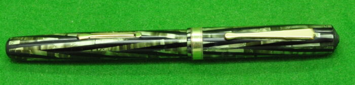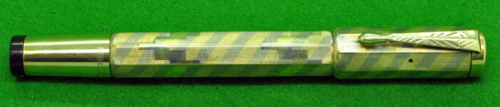 Beautiful Scarce Watermans number 7 in Emerald Ray with gold filled trim. In Perfect  condition. Cap Band Engraved J.S.M 1939. Fitted with the original 14kt gold Full Flex, Wet Noodle Nib giving a wonderful writing Style.