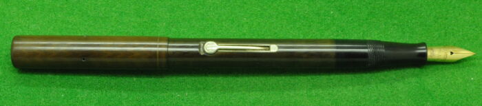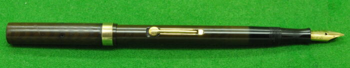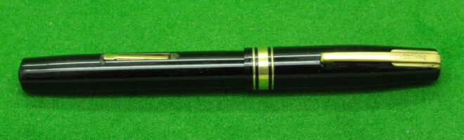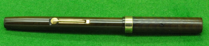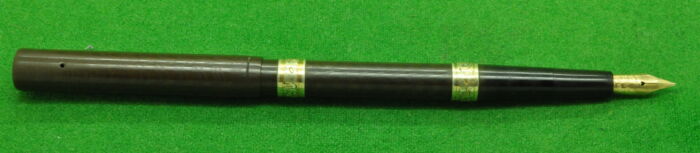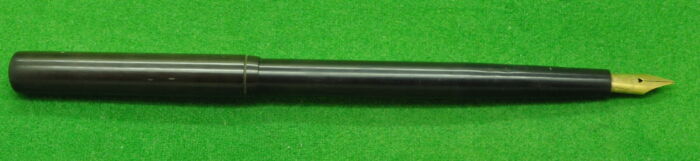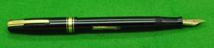 Watermans 52  in Black Hard Rubber with Nickel Silver trim. In Good condition but with discolouration and Wear. Fitted with the original 14kt gold full flex, wet noodle nib giving a wonderful writing style.