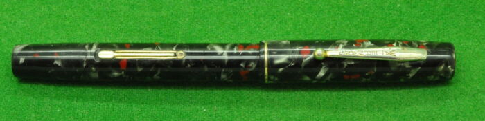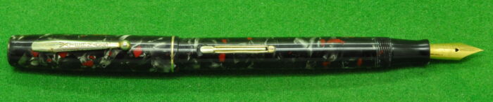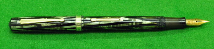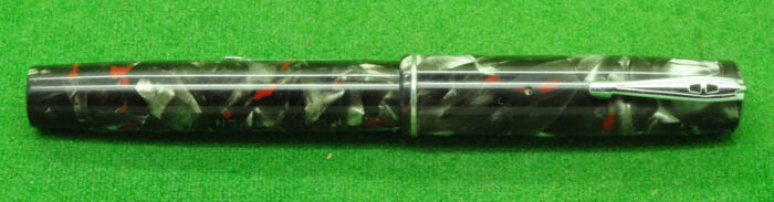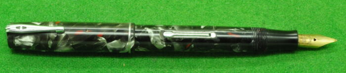 Stunning Watermans 92V in Pearl Grey with Scarlet Flecks with Nickel Silver trim. In remarkable Mint Condition.  Fitted with the original 14kt gold Full flex medium tipped nib giving a wonderful writing style.