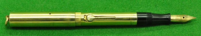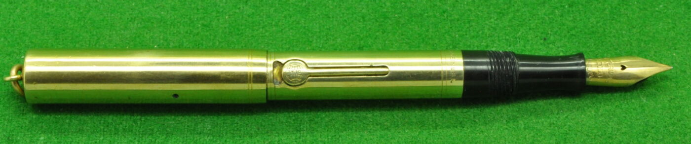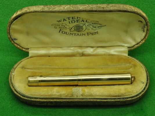 Watermans 0552 1/2 V  Ladies Pen in Gold fill Plain Finish. In Good Condition in original Beautiful Box. Pen has some Brassing to end of barrel and Box missing the Pencil. Engraved “Sheila Margaret Syme 1929” Fitted with the original 14kt gold Semi Flex Medium tipped nib.