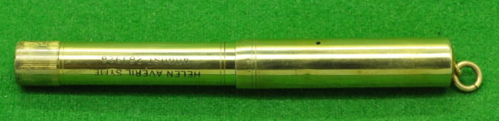 Watermans 0552 1/2 V  Ladies Pen in Gold fill Plain Finish. In Good Condition . Pen has some Brassing to end of barrel . Engraved “Helen Averil Syme 1926” Fitted with the original 14kt gold Semi Flex Medium tipped nib.