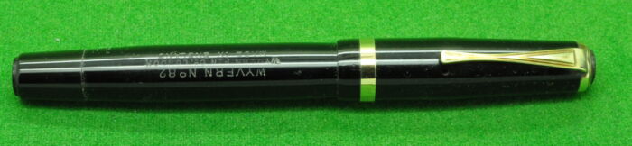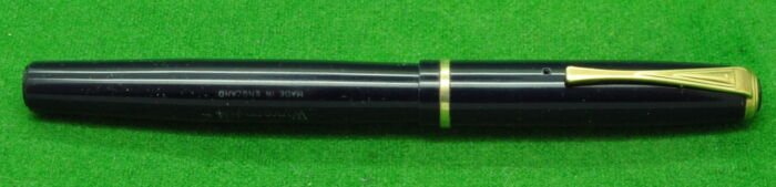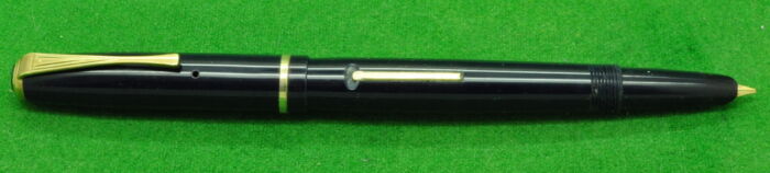 Scarce Wyvern 630 in Black with gold filled trim. In Near Mint condition. Lever fill. Fitted with the original 14kt gold semi flex  fine  tipped very smooth nib