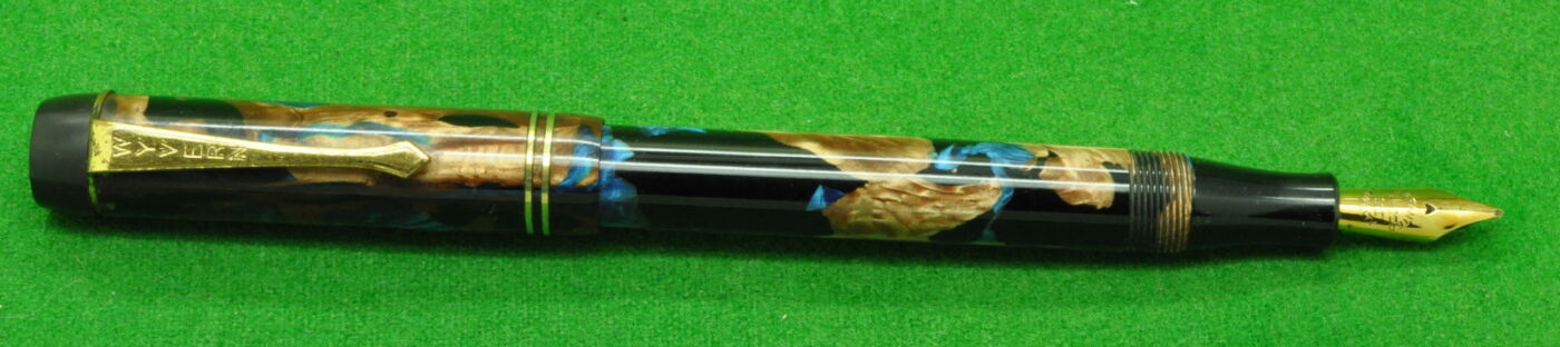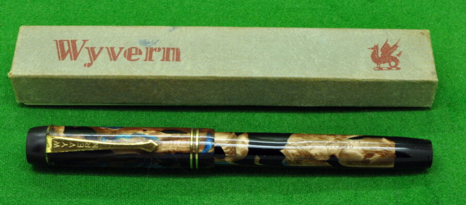 Stunning Wyvern 5c in Bronze, Blue and Black Marble with Gold filled trim. In Absolute MINT Unused Condition in original Box. Fitted with the original 14kt gold full flex ,Broad tipped nib giving a wonderful writing style. Beautiful item in remarkable condition