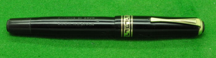 Scarce Large Wyvern 82 in Black with gold fille trim. In Perfect Near Mint Condition. Button fill. Fitted with the original 14kt gold semi flex ,medium tipped  nib