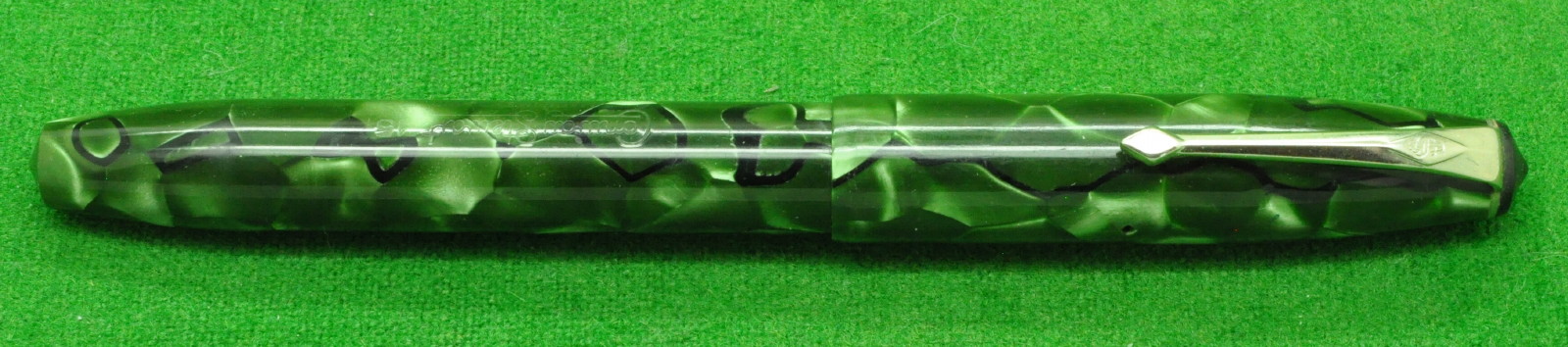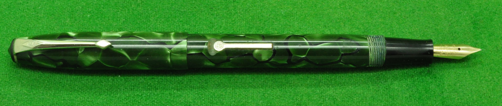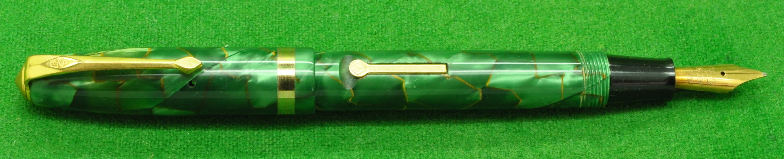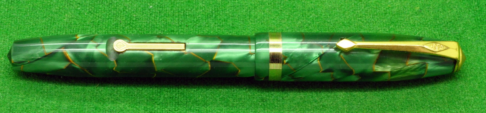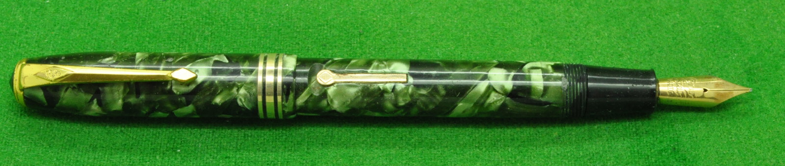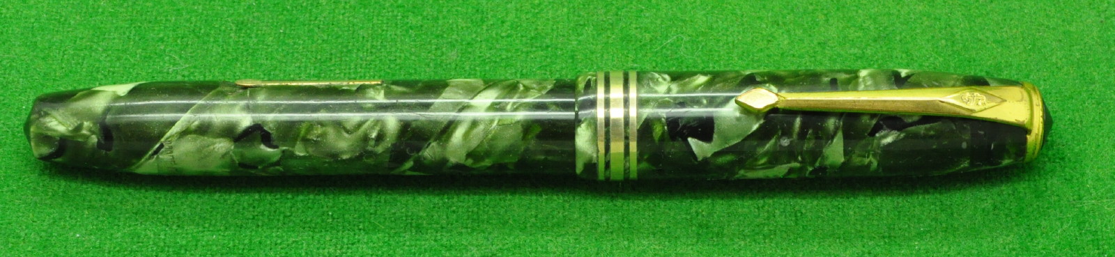 Early Scarce Conway Stewart 24 in Lined Green Marble with Gold filled trim. In Absolute Mint Condition. Fitted with the original, super Smooth 14kt gold, Medium tipped nib