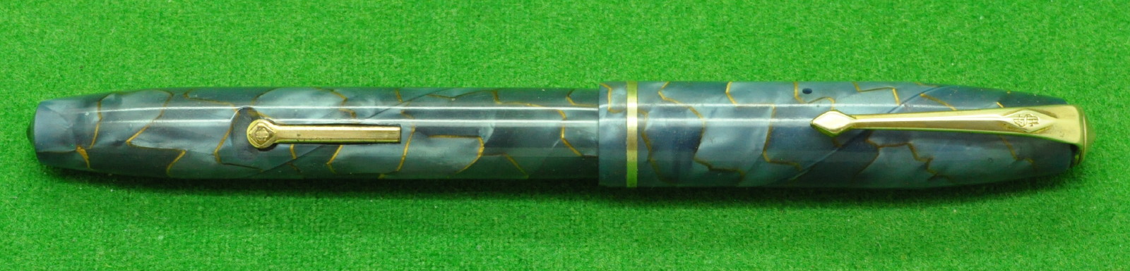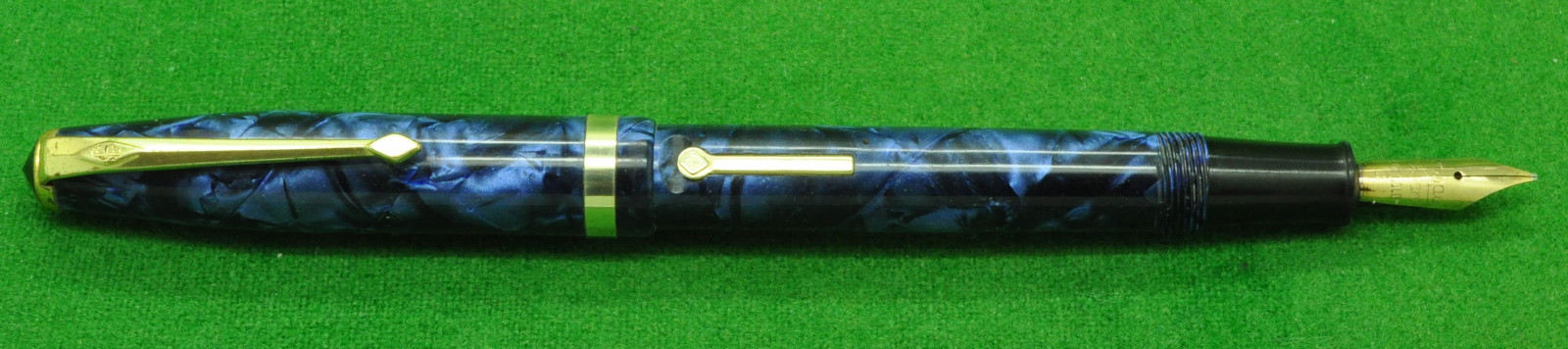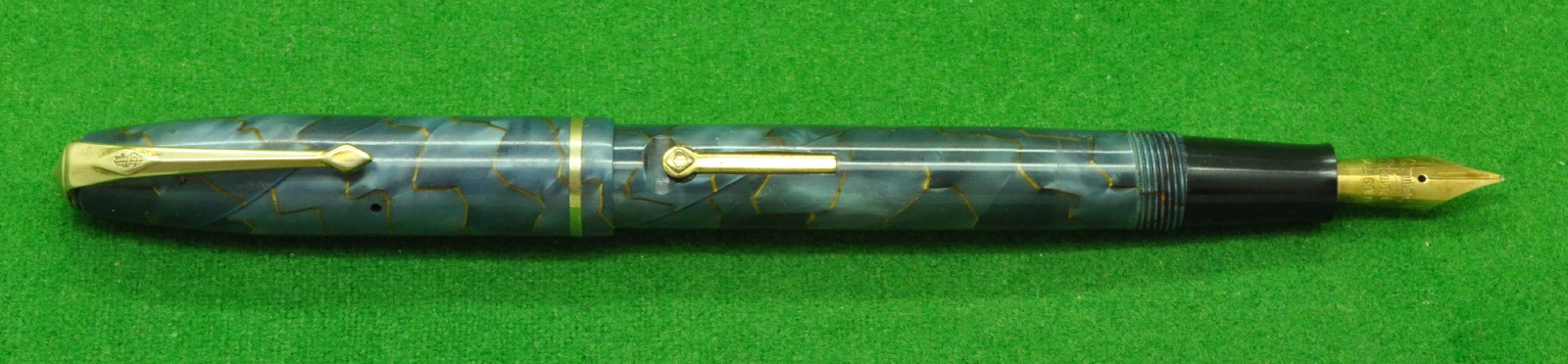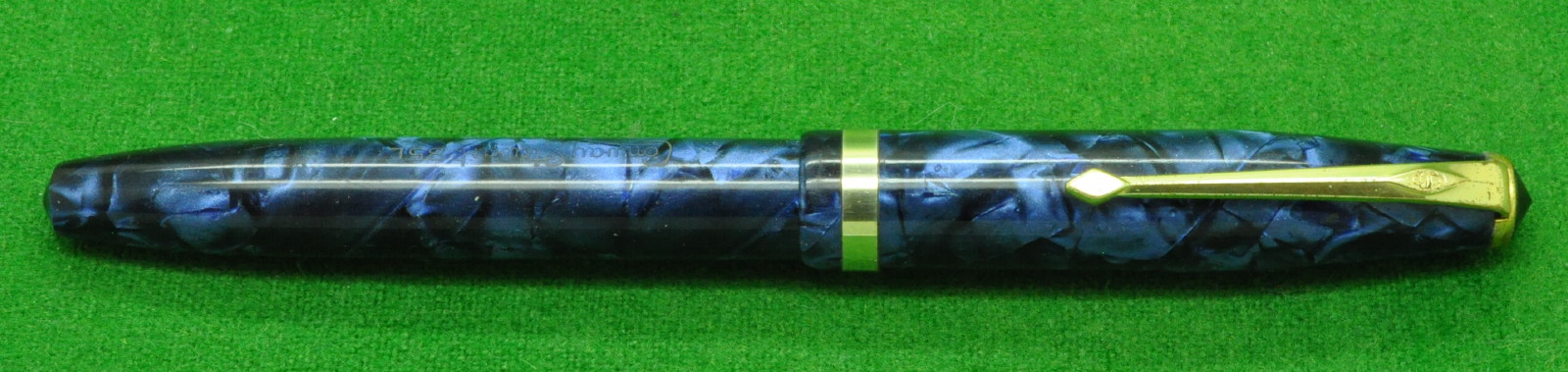 Early Scarce Conway Stewart 24 in Pearl Blue and Black Marble with Gold filled trim. In Absolute Mint Condition. Fitted with the original, super Smooth 14kt gold, Medium tipped nib