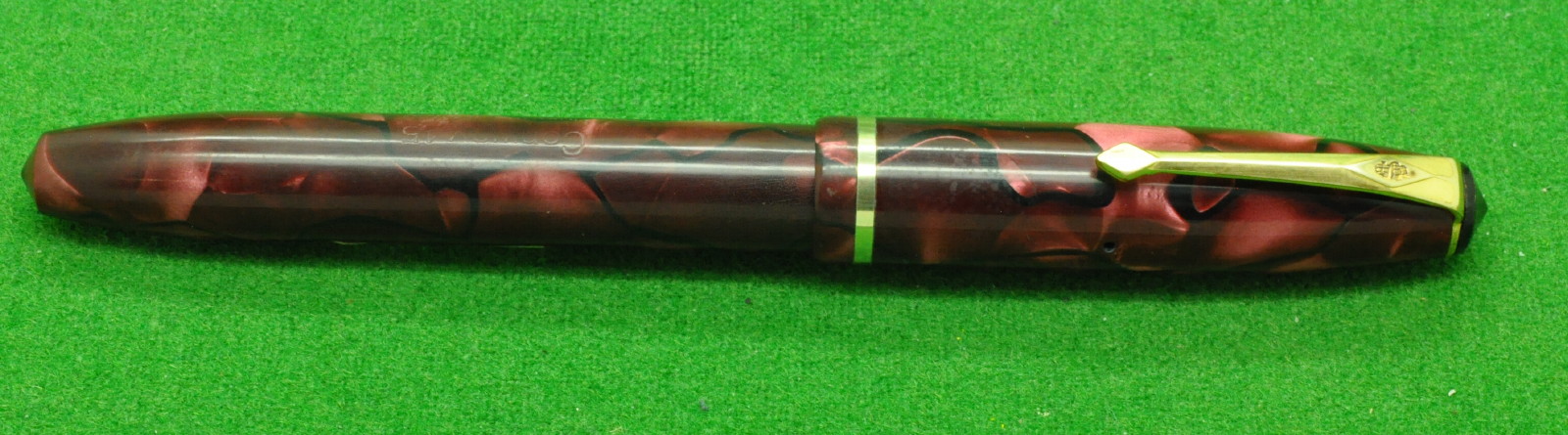 Scarce Conway Stewart 27 in Burgundy Lined Marble with Gold filled trim. In Absolute Mint Condition. Fitted with the original 14kt gold, Semi Flex Medium tipped nib