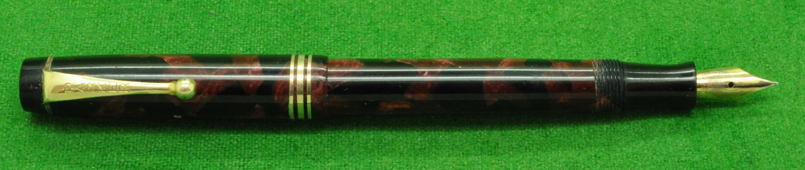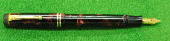 Beautiful Parker Duofold Deluxe Modern Junior in Burgundy & Black marble with gold filled trim. In Absolute Mint condition . Button Fill. Fitted with an original 14kt gold, semi flex, medium to fine tipped Nib.