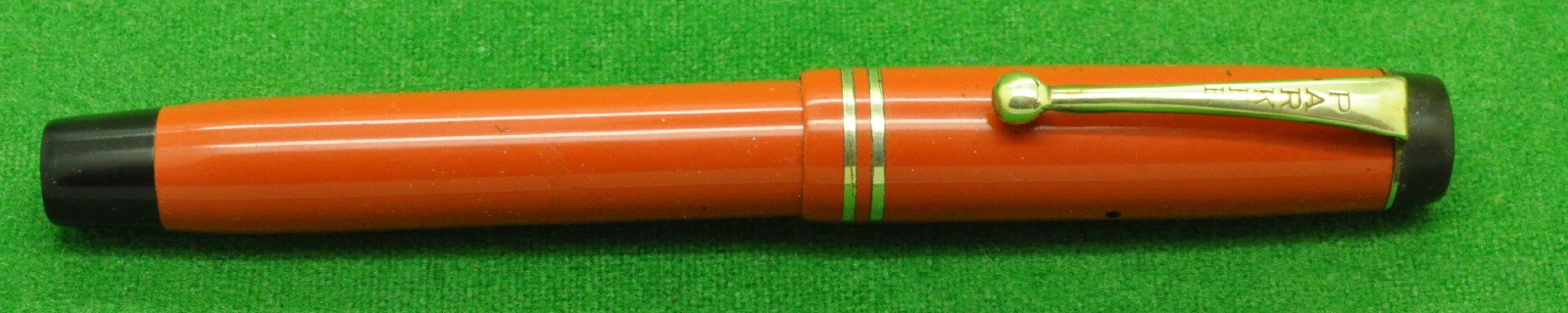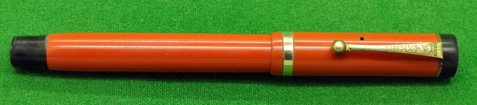 Early Parker Duofold Special in Red with Gold filled trim. In Perfect Nr Mint Condition. Button Fill. Fitted with the original 14kt gold, Medium to fine tipped nib. Long Full size pen measuring 136 mm long capped.
