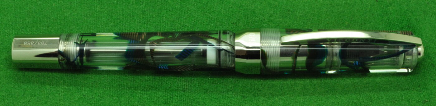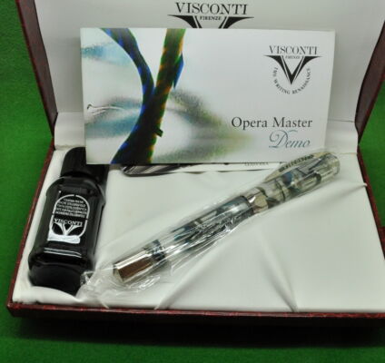 Stunning Limited Edition Visconti Opera Master Demo in Clear and Lined Blue Finish with Platinum Fill. one of only 888 made. In Mint Unused condition in original Box with all Paperwork and outer Packaging. Double Reservoir power Filler system. Never Inked. Fitted with the original Twin tone 18kt gold, semi flex medium tipped nib. Large, Highly Collectable pen.
