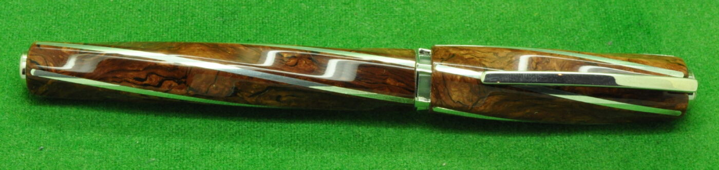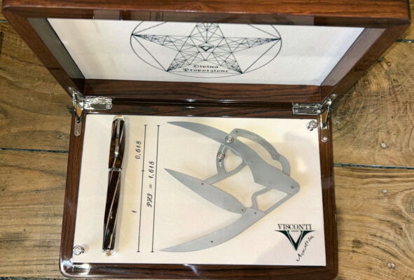 Beautiful Limited Edition Visconti Divina Proporzione in Briar Wood effect with Sterling silver Highlights and trim. Number 1041 of only 1618 made. In Mint Unused condition in original Box with all Accessories, Paperwork and outer Packaging. Pull Touchdown filler system. Never Inked. Fitted with the original Twin tone 18kt gold, semi flex medium tipped nib. Large, Highly Collectable pen.