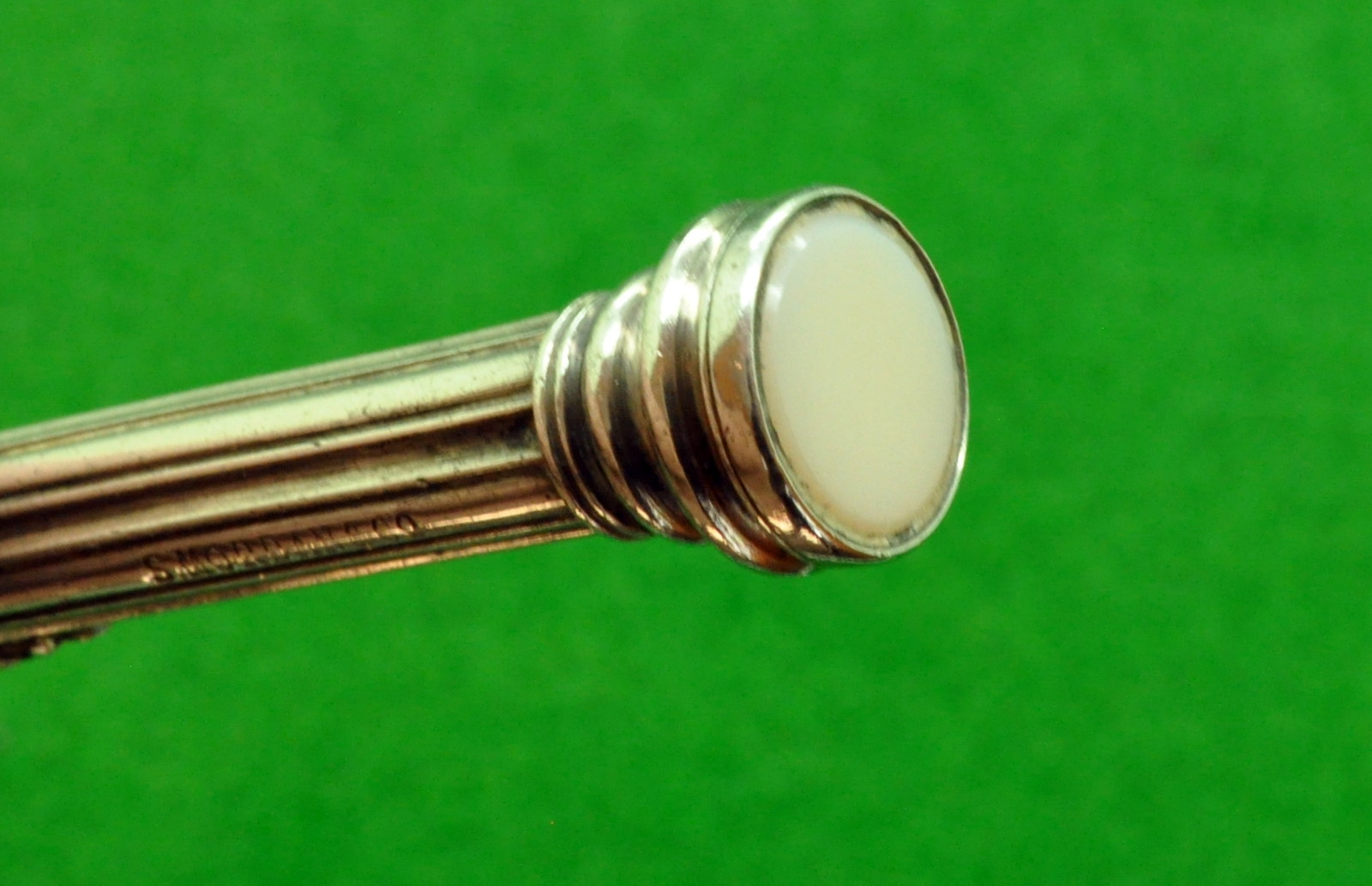 Stunning S Mordan & Co Slide Pencil in solid 10kt Gold with fine Dot Pattern and a beautiful Dark Green Finial Stone with Scarlet Flecks. This pen is in remarkable MINT Condition. Marked with Mordans Gold arrow indicating solid 10kt gold. Works Perfectly. Measures 92 mm long closed and 117 mm when extended. Exceptional Quality Piece