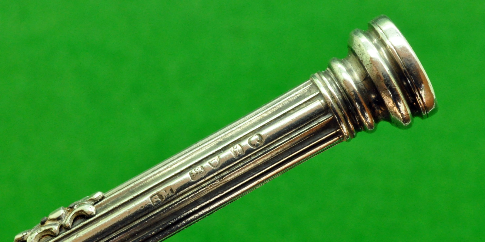 Early S Mordan & Co Combination Slide Pencil and dip pen in solid Silver, fine barley pattern with beautiful Finial Stone. Fully Hallmarked and dated 1873. In Perfect Condition . Measures 92 mm long closed and 122 when nib extended.